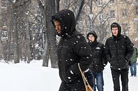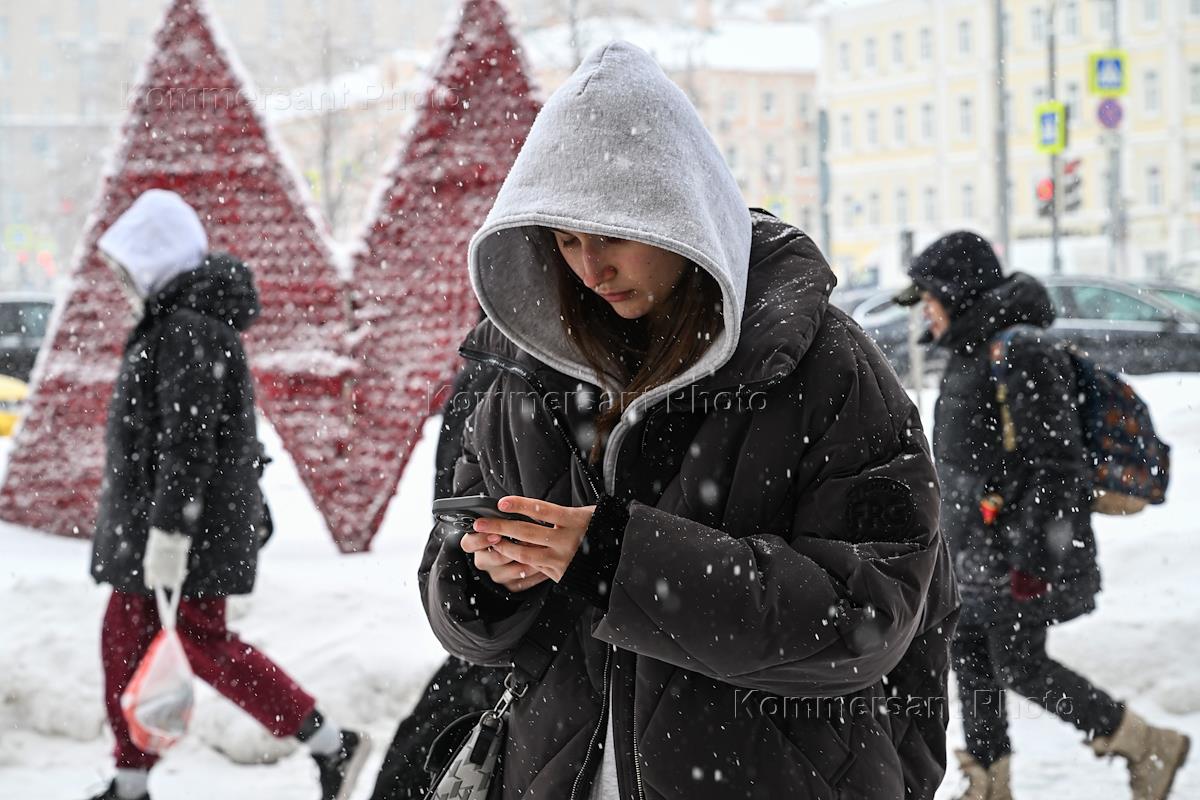 Жанровая фотография. Снегопад в городе. Люди идут во время снегопада у станции метрополитена "Белорусская".