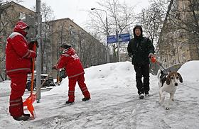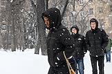 Жанровая фотография. Снегопад в городе. Сотрудники коммунальной службы города во время уборки снега. Расчистка тротуара в центре города.