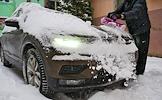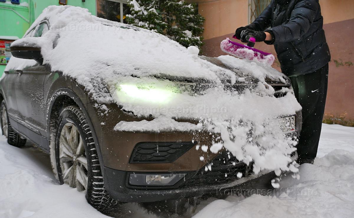 Жанровая фотография. Снегопад в городе. Мужчина во время чистки снега с припаркованного автомобиля.