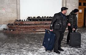 Жанровая фотография. Снегопад в городе. Мужчины с чемоданами у входа на станцию метрополитена "Белорусская".