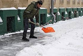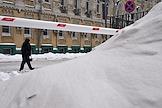 Жанровая фотография. Снегопад в городе. Сотрудник коммунальной службы во время уборки снега на тротуаре.