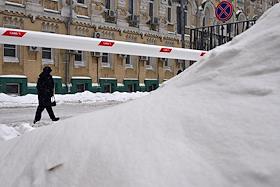 Жанровая фотография. Снегопад в городе. Занесенный снегом въезд на территорию.