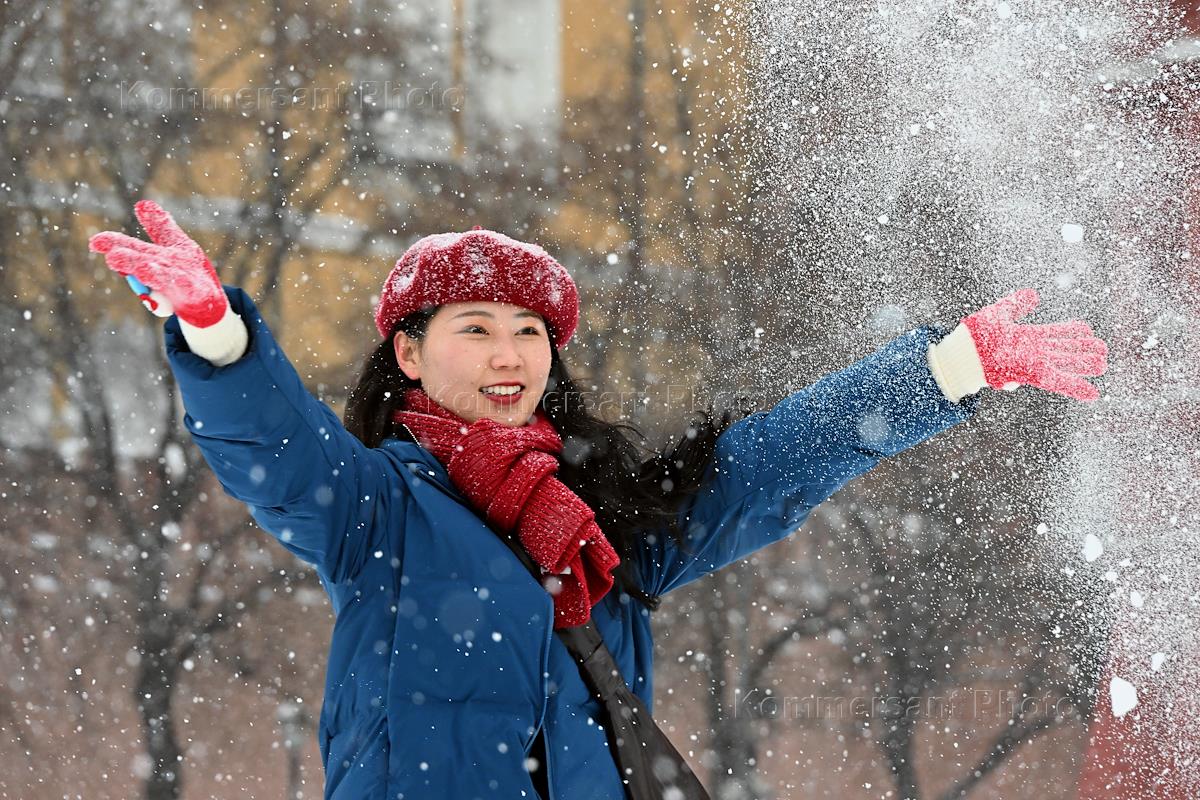 Виды Москвы во время снегопада. Жанровая фотография. Иностранная туристка в Александровском саду.