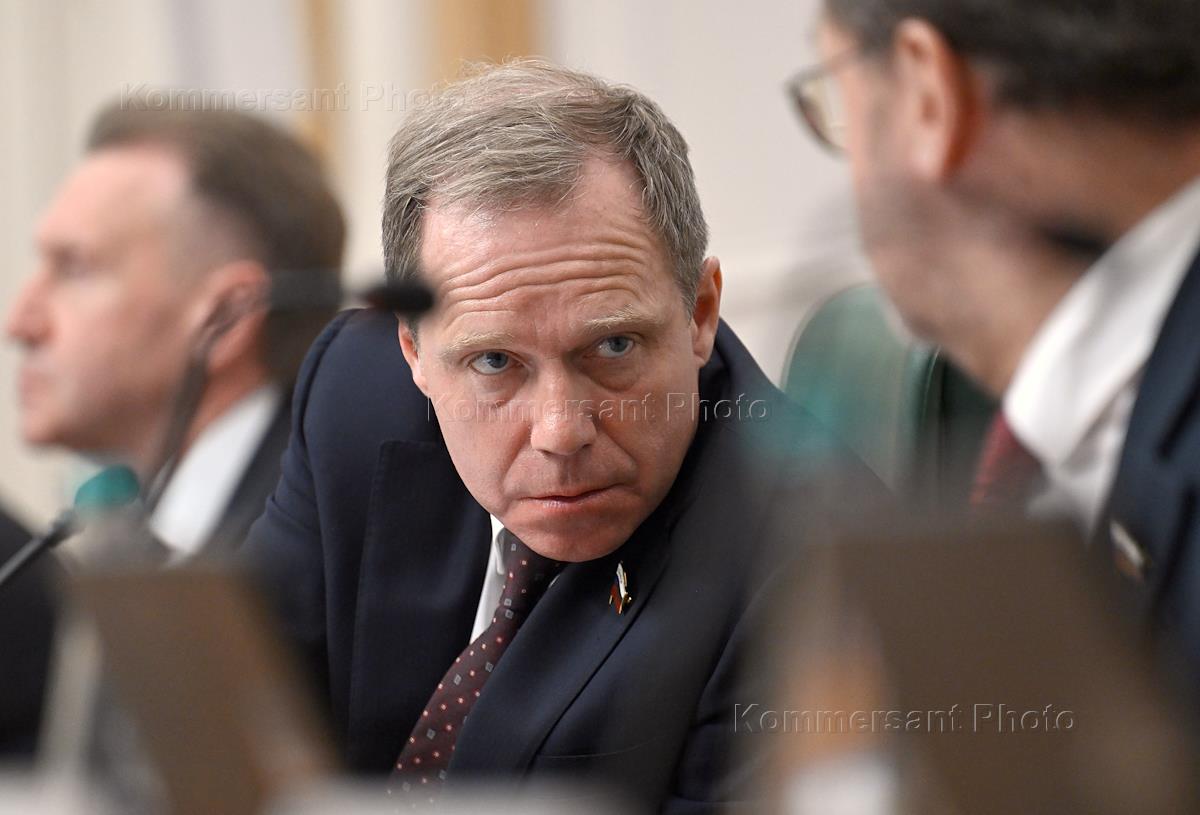 Парламентские слушания "Государственная корпорация развития "ВЭБ.РФ" как платформа технологического лидерства для координации институтов развития" в Совете Федерации России. Заместитель министра науки и высшего образования России Денис Секиринский перед началом слушаний.