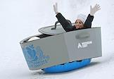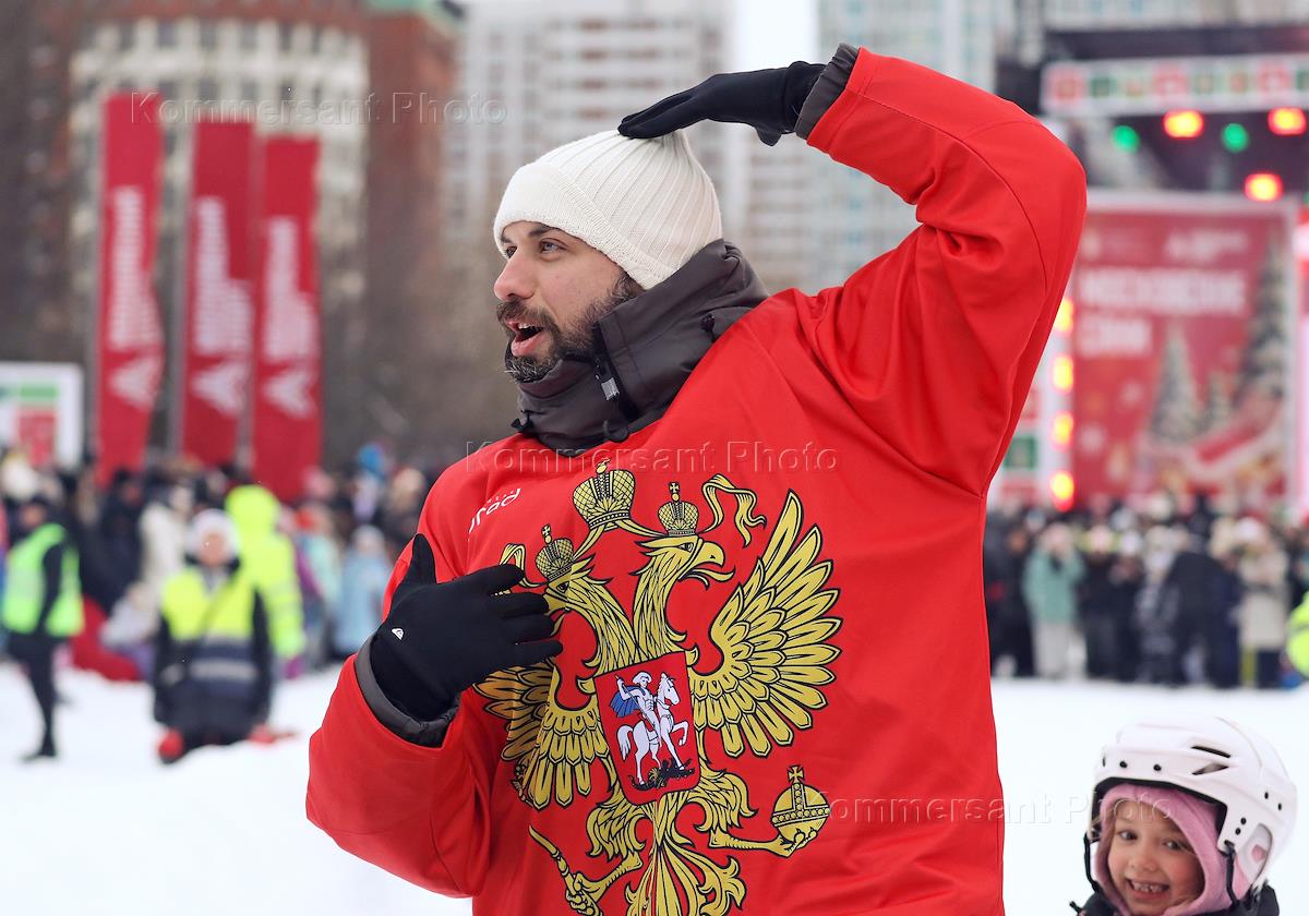 Фестиваль "Сани" от "Московских сезонов" в Крылатском. Жанровая фотография. Соревнования по катанию на ватрушках с горы. Телеведущий Иван Чуйков во время соревнований.