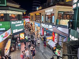 Виды города Саньи. Жанровая фотография. Пешеходная улица с ресторанами и торговыми помещениями.