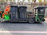 Виды города Саньи. Жанровая фотография. Уборщик мусора на тележке с мусорными баками.