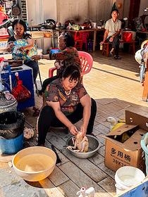 Виды города Саньи. Жанровая фотография. Женщина во время ощипывания курицы на улице.