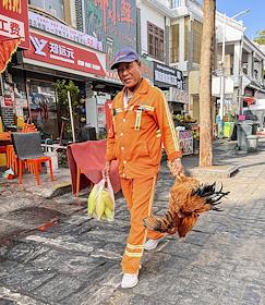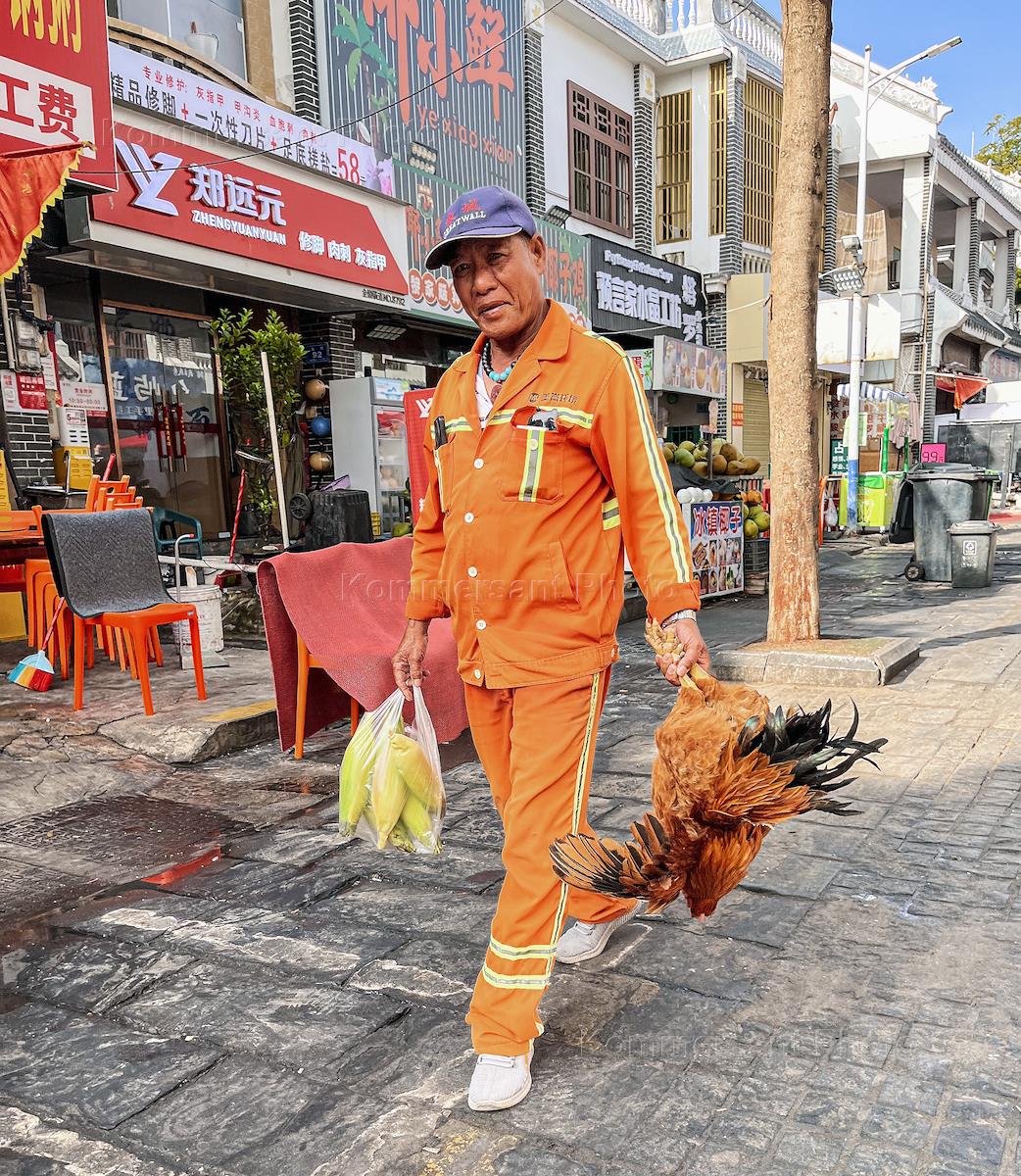Виды города Саньи. Жанровая фотография. Мужчина с живой курицей идет с рынка.