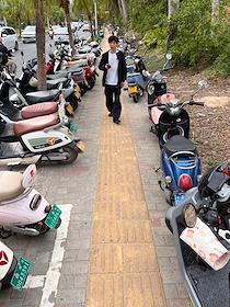Виды города Саньи. Жанровая фотография. Мальчик проходит мимо парковки мопедов и мотоциклов на обочине дороги.