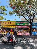 Виды города Саньи. Жанровая фотография. Двое людей на мопеде едут по торговой улице.