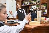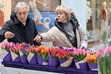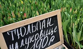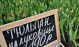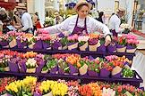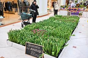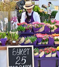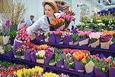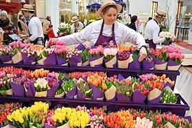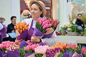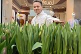 Цветочная ярмарка "Пассаж в цветах" в Петровском Пассаже. Флорист у прилавка с тюльпанами на ярмарке.