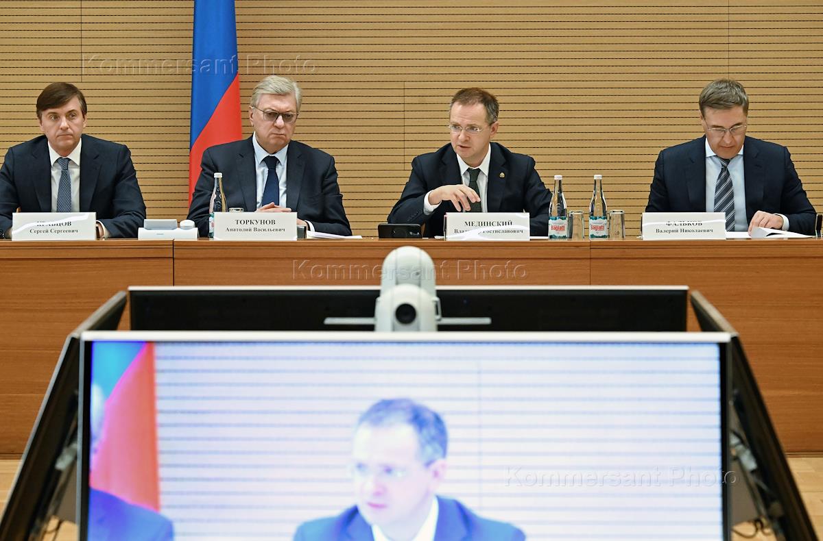 Meeting of the Interdepartmental Commission on Historical Education at the Russian Presidential Executive Office. From left to right: Russian Minister of Education Sergei Kravtsov, Rector of the Moscow State Institute of International Relations (MGIMO) of the Russian Ministry of Foreign Affairs Anatoly Torkunov, Presidential Aide Vladimir Medinsky and Russian Minister of Science and Higher Education Valery Falkov during the meeting.