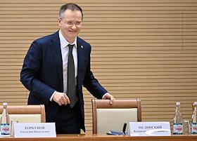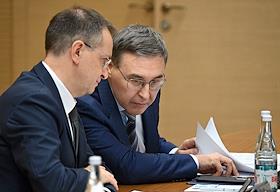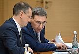 Meeting of the Interdepartmental Commission on Historical Education at the Russian Presidential Executive Office. Presidential Aide Vladimir Medinsky (left) and Minister of Science and Higher Education Valery Falkov (right) during the meeting.