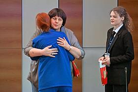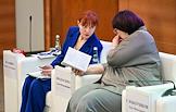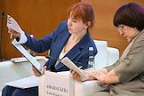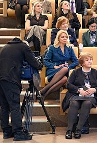 The Second All-Russian Symposium "The Female Face of the New World Order" at the State Duma of Russia. Representative of the Orenburg Region executive body Elena Afanasyeva (left) at the symposium.