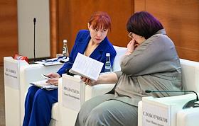 The Second All-Russian Symposium "The Female Face of the New World Order" at the State Duma of Russia. Representative of the Orenburg Region executive body Elena Afanasyeva (right) and Vice-Rector for Research at the Zhirinovsky University of World Civilizations Maria Bulavina at the symposium.