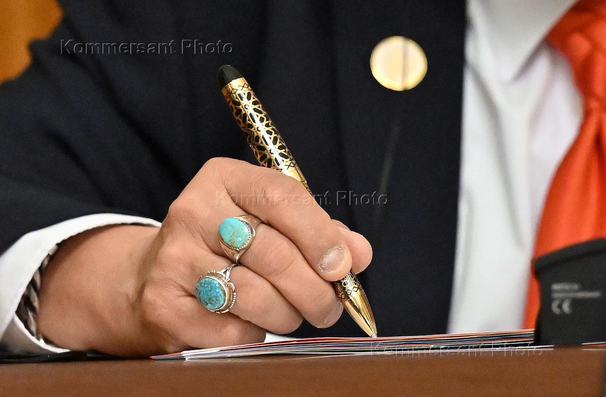Переговоры министра иностранных дел России Сергея Лаврова со вторым министром иностранных дел Государства Бруней-Даруссалам Эриваном Юсофом в Доме приемов МИД России. Жанровая фотография. Журналистка перед началом переговоров.