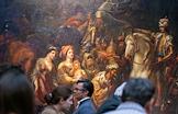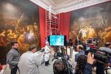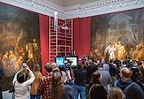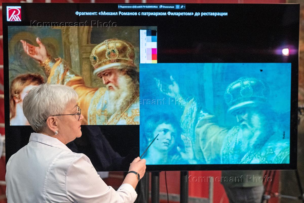 Заседание Совета реставраторов Государственного Русского музея в корпусе Бенуа. Сотрудник реставрационной мастерской показывает особенности реставрационного процесса.
