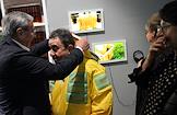 Церемония открытия Второй международной биеннале "Искусство будущего" в Мультимедиа Арт музее. Художник Андрей Бартенев (в центре) на церемонии.