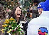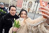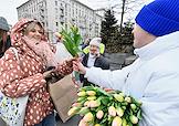 Акция "Вам, любимые" в рамках празднования Международного женского дня на улицах города. Вручение тюльпанов женщинам на Тверской площади.