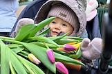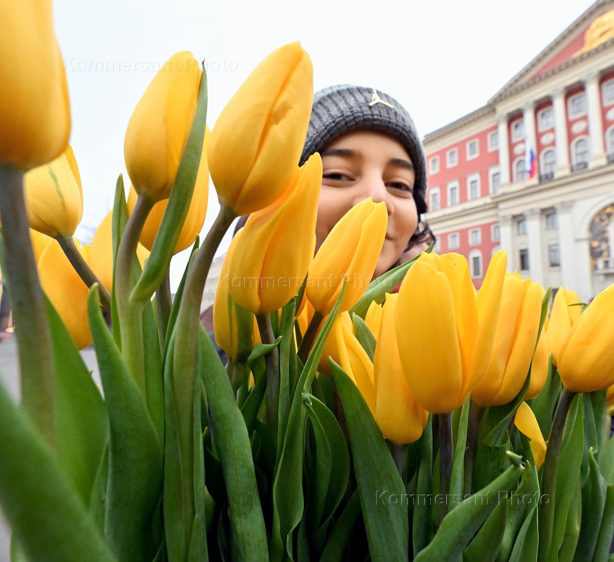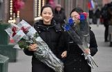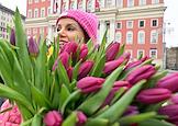Акция "Вам, любимые" в рамках празднования Международного женского дня на улицах города. Девушки с букетами тюльпанов на Тверской площади.