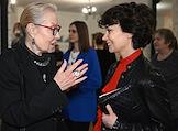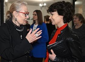 Церемония открытия 14-го сезона Международного фестиваля современной хореографии Context Diana Vishneva. Спектакль "Хора" хореографа Охада Наарина на музыку Исао Томита в исполнении труппы Context на сцене Театра Ермоловой. Журналист Евгения Милова (слева) и директор Мультимедиа Арт Музея Ольга Свиблова (справа) перед началом спектакля.