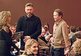 Церемония открытия 14-го сезона Международного фестиваля современной хореографии Context Diana Vishneva. Спектакль "Хора" хореографа Охада Наарина на музыку Исао Томита в исполнении труппы Context на сцене Театра Ермоловой. Художественный руководитель Государственного театра наций Евгений Миронов во время сбора гостей перед началом спектакля.