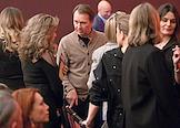 Церемония открытия 14-го сезона Международного фестиваля современной хореографии Context Diana Vishneva. Спектакль "Хора" хореографа Охада Наарина на музыку Исао Томита в исполнении труппы Context на сцене Театра Ермоловой. Председатель совета директоров "Азимут Хотелс Компани" Александр Клячин (в центре) и директор по развитию Московской школы управления "Сколково" Наталья Тимакова (справа) во время сбора гостей перед началом спектакля.