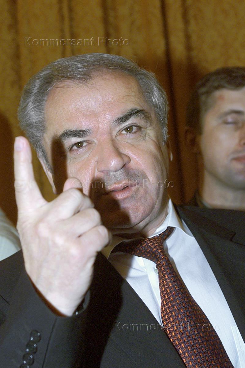 Глава РАО "Норильский никель" Джонсон Хагажеев (в центре) и председатель совета директоров РАО "Норильский никель" Юрий Котляр (справа) на ежегодном собрании акционеров, которое состоялось в здании Финансовой Академии.