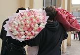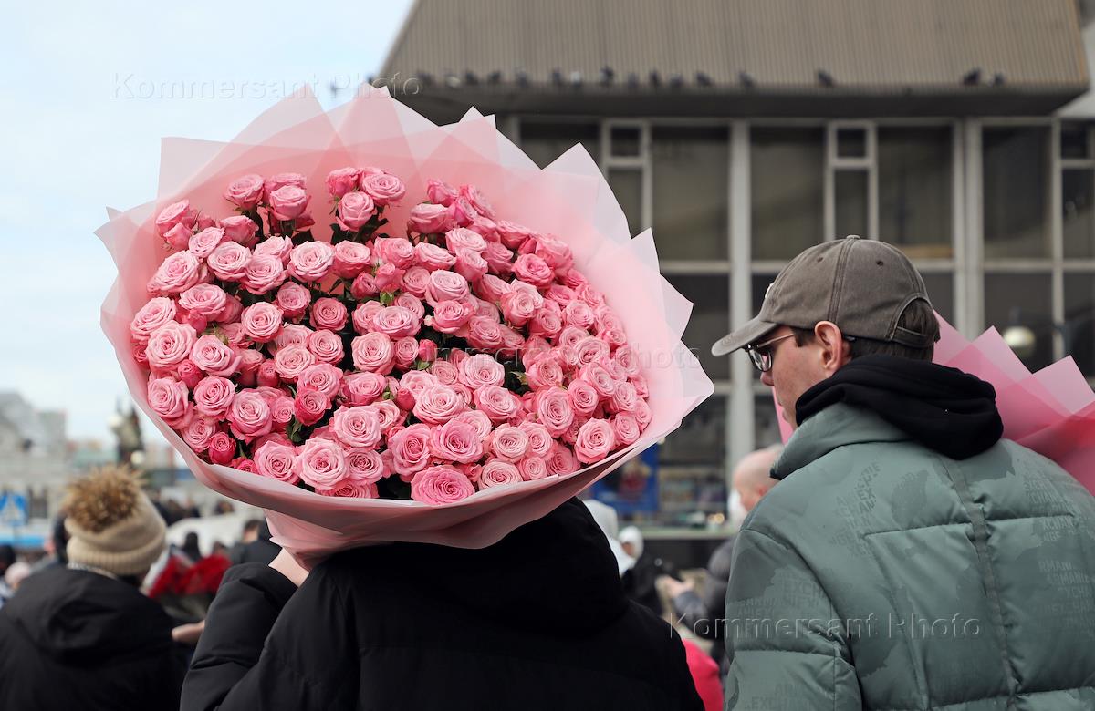 Празднование Международного женского дня 8 марта в Москве. Жанровая фотография. Мужчин с корзиной роз.