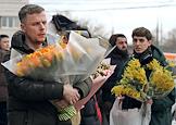 Празднование Международного женского дня 8 марта в Москве. Жанровая фотография. Молодые люди с букетами тюльпанов.