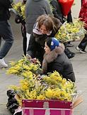 Празднование Международного женского дня 8 марта в Москве. Жанровая фотография. Женщина покупает букеты мимозы.