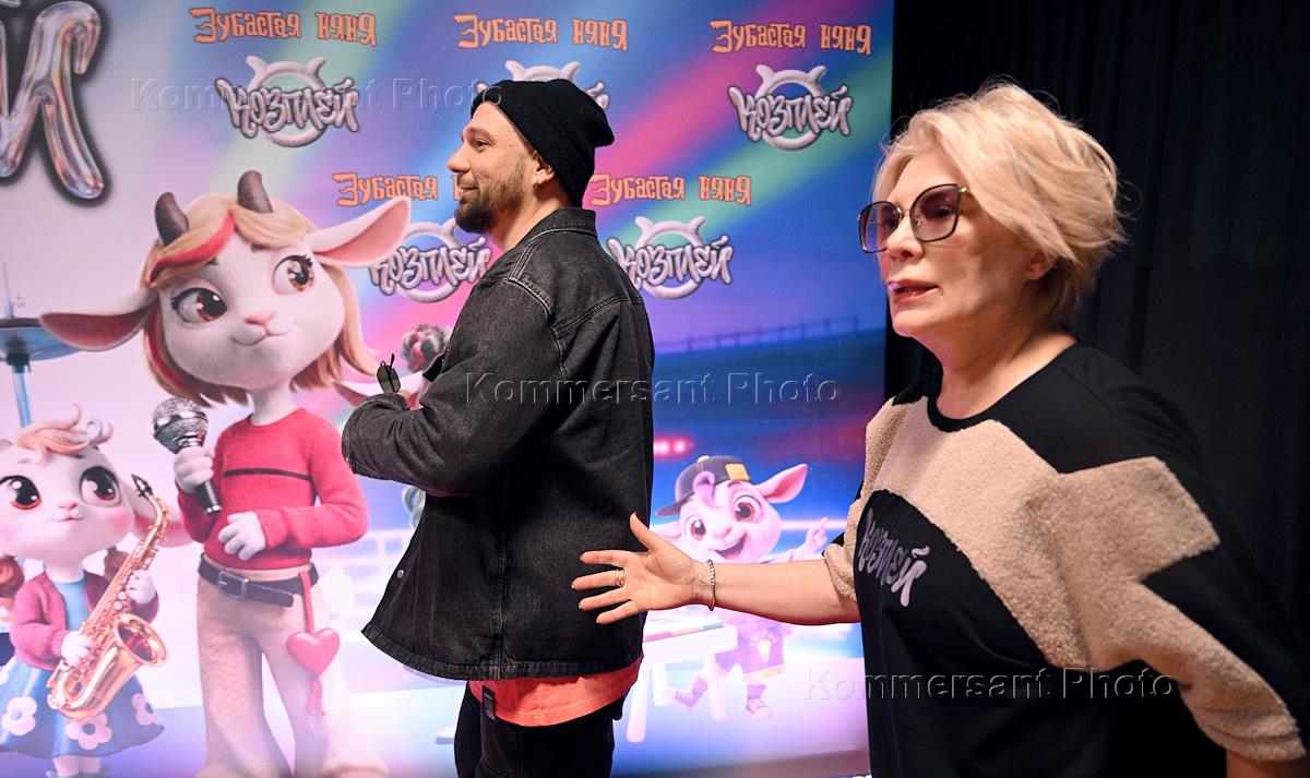 Презентация первого трека виртуальной музыкальной группы "КОЗПЛЕЙ" (мюзикл "Зубастая няня") продюсера Лины Арифулиной в креативном пространстве "Люмьер-холл". Продюсер Лина Арифулина (слева) и певец, солист группы "Корни" Александр Бердников (в центре) на презентации.