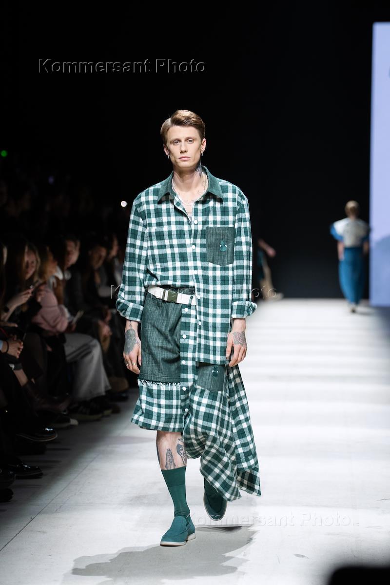 Шестая Московская неделя моды в Центральном выставочном зале "Манеж". Показ моделей одежды Stas Lopatkin дизайнера и художника Стаса Лопаткина. Модель во время показа.