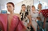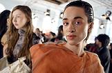 Шестая Московская неделя моды в Центральном выставочном зале "Манеж". Показ Школы дизайна НИУ ВШЭ. Жанровая фотография. Модели во время подготовки к показу.