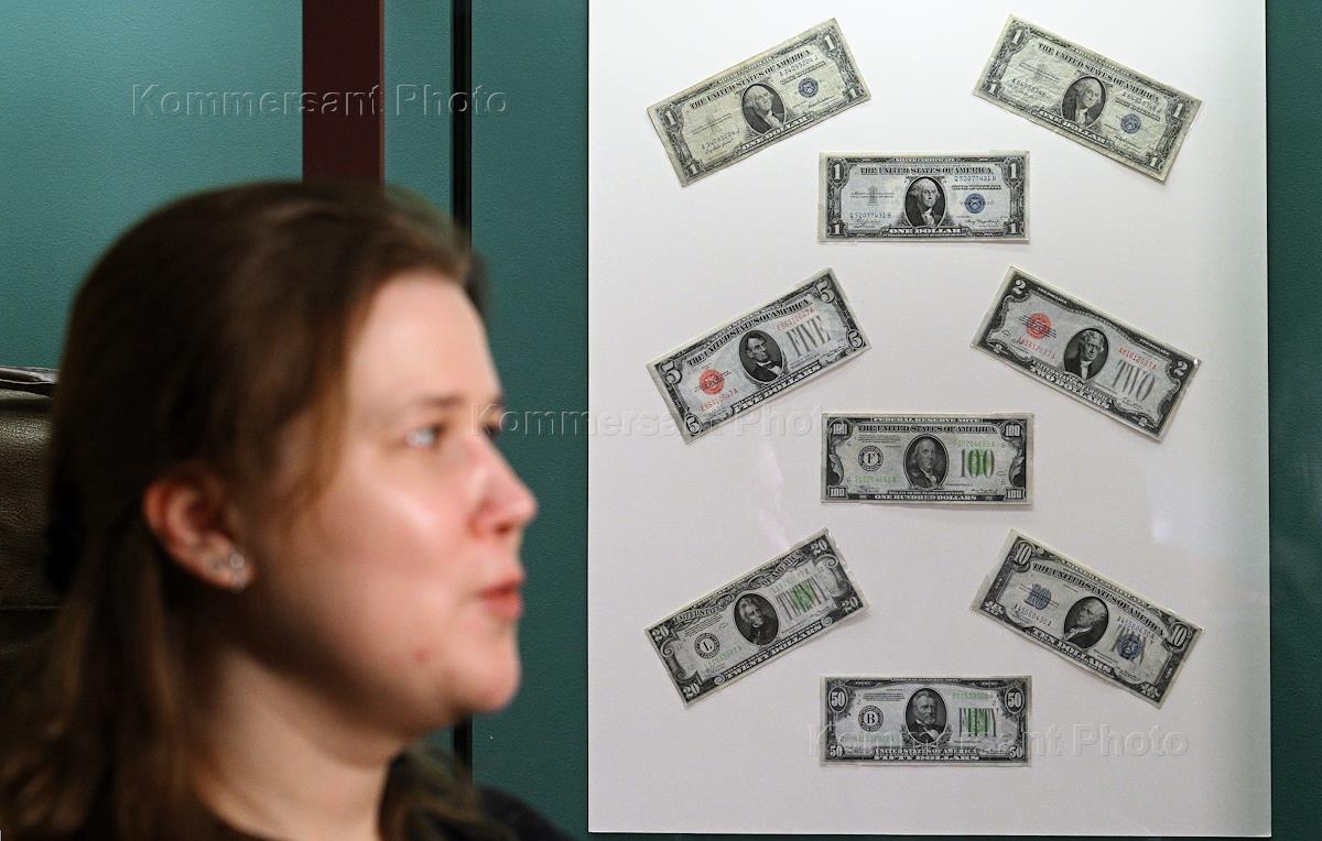 Пресс-показ выставки "Люди как люди. Любят деньги". Деньги в романе Михаила Булгакова "Мастер и Маргарита" в Государственном Историческом музее. Научный сотрудник отдела нумизматики Государственного Исторического музея Елена Семилетникова (слева) на пресс-показе.