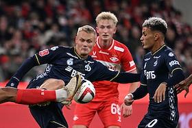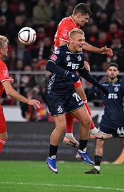 Фонбет - Кубок России по футболу 2025/26. 1/2 финала. Матч между командами "Спартак" (Москва) - "Динамо" (Москва) на стадионе "Лукойл Арена". Игрок команды "Динамо" Данил Глебов (слева) во время матча.