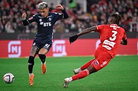 Фонбет - Кубок России по футболу 2025/26. 1/2 финала. Матч между командами "Спартак" (Москва) - "Динамо" (Москва) на стадионе "Лукойл Арена". Игрок команды "Динамо" Бителло (слева) во время матча.