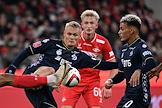 Фонбет - Кубок России по футболу 2025/26. 1/2 финала. Матч между командами "Спартак" (Москва) - "Динамо" (Москва) на стадионе "Лукойл Арена". Слева направо: игрок команды "Динамо" Константин Тюкалов, игрок команды "Спартак" Руслан Литвинов и игрок команды "Динамо" Бителло во время матча.
