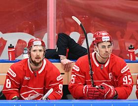 Континентальная Хоккейная Лига (КХЛ). Матч между командами "Спартак" (Москва) - ЦСКА (Москва) на стадионе "Мегаспорт". Игроки команды "Спартак" Александр Беляев (слева) и Герман Рубцов (справа) во время матча.