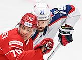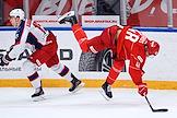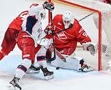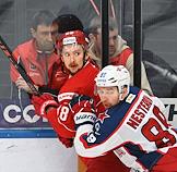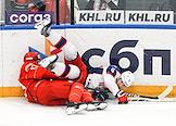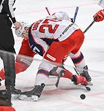 Континентальная Хоккейная Лига (КХЛ). Матч между командами "Спартак" (Москва) - ЦСКА (Москва) на стадионе "Мегаспорт". Игрок команды "Спартак" Сергей Лукьянцев (слева) и игрок команды ЦСКА Джереми Рой (справа) во время матча.