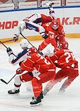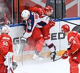 Континентальная Хоккейная Лига (КХЛ). Матч между командами "Спартак" (Москва) - ЦСКА (Москва) на стадионе "Мегаспорт". Игрок команды ЦСКА Иван Дроздов (второй слева) во время матча.
