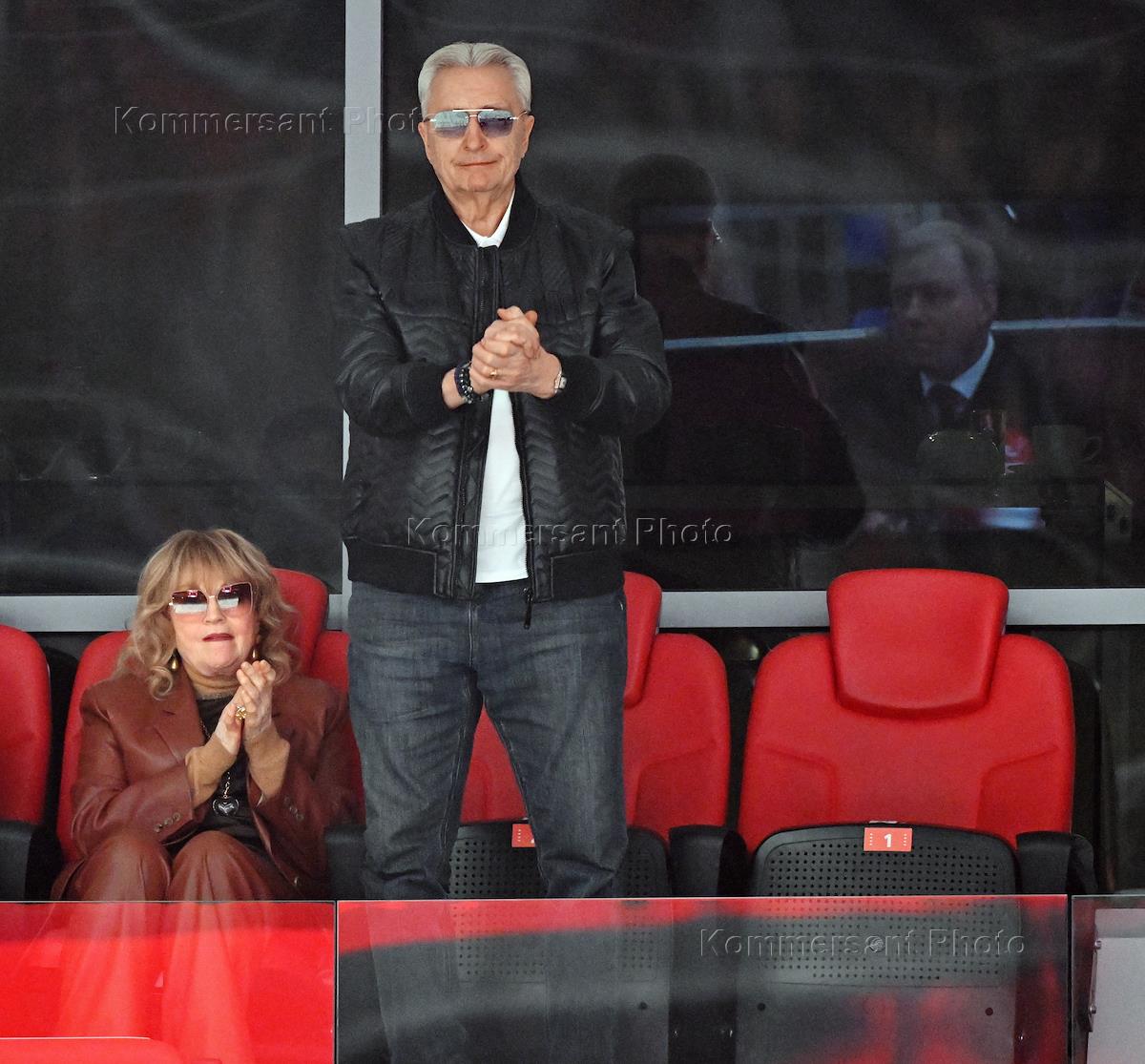Континентальная Хоккейная Лига (КХЛ). Матч между командами "Спартак" (Москва) - ЦСКА (Москва) на стадионе "Мегаспорт". Председатель Совета легенд НХЛ Александр Якушев (справа) на зрительской трибуне перед началом матча.