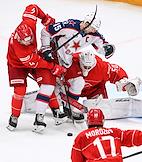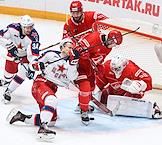 Континентальная Хоккейная Лига (КХЛ). Матч между командами "Спартак" (Москва) - ЦСКА (Москва) на стадионе "Мегаспорт". Вратарь команды "Спартак" Артём Загидулин (справа) во время матча.