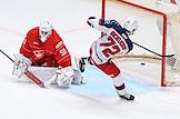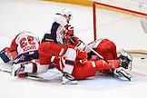 Континентальная Хоккейная Лига (КХЛ). Матч между командами "Спартак" (Москва) - ЦСКА (Москва) на стадионе "Мегаспорт". Вратарь команды "Спартак" Артём Загидулин (слева) и игрок команды ЦСКА Дмитрий Бучельников (справа) во время матча.