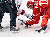Континентальная Хоккейная Лига (КХЛ). Матч между командами "Спартак" (Москва) - ЦСКА (Москва) на стадионе "Мегаспорт". Игрок команды ЦСКА Дмитрий Саморуков (справа) и игрок команды "Спартак" Михаил Мальцев (слева) во время матча.