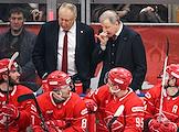 Континентальная Хоккейная Лига (КХЛ). Матч между командами "Спартак" (Москва) - ЦСКА (Москва) на стадионе "Мегаспорт". Главный тренер команды "Спартак" Алексей Жамнов (в центре, справа) и тренер вратарей Сергей Климкович (в центре, слева) во время матча.