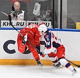 Континентальная Хоккейная Лига (КХЛ). Матч между командами "Спартак" (Москва) - ЦСКА (Москва) на стадионе "Мегаспорт". Игрок команды ЦСКА Никита Нестеров (справа) и игрок команды "Спартак" Александр Беляев (слева) во время матча.