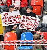 Континентальная Хоккейная Лига (КХЛ). Матч между командами "Спартак" (Москва) - ЦСКА (Москва) на стадионе "Мегаспорт". Болельщики команды "Спартак" на зрительской трибуне с плакатами во время матча.