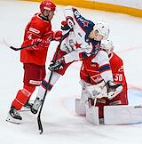 Континентальная Хоккейная Лига (КХЛ). Матч между командами "Спартак" (Москва) - ЦСКА (Москва) на стадионе "Мегаспорт". Вратарь команды "Спартак" Артём Загидулин (справа) и игрок команды ЦСКА Павел Карнаухов (в центре) во время матча.